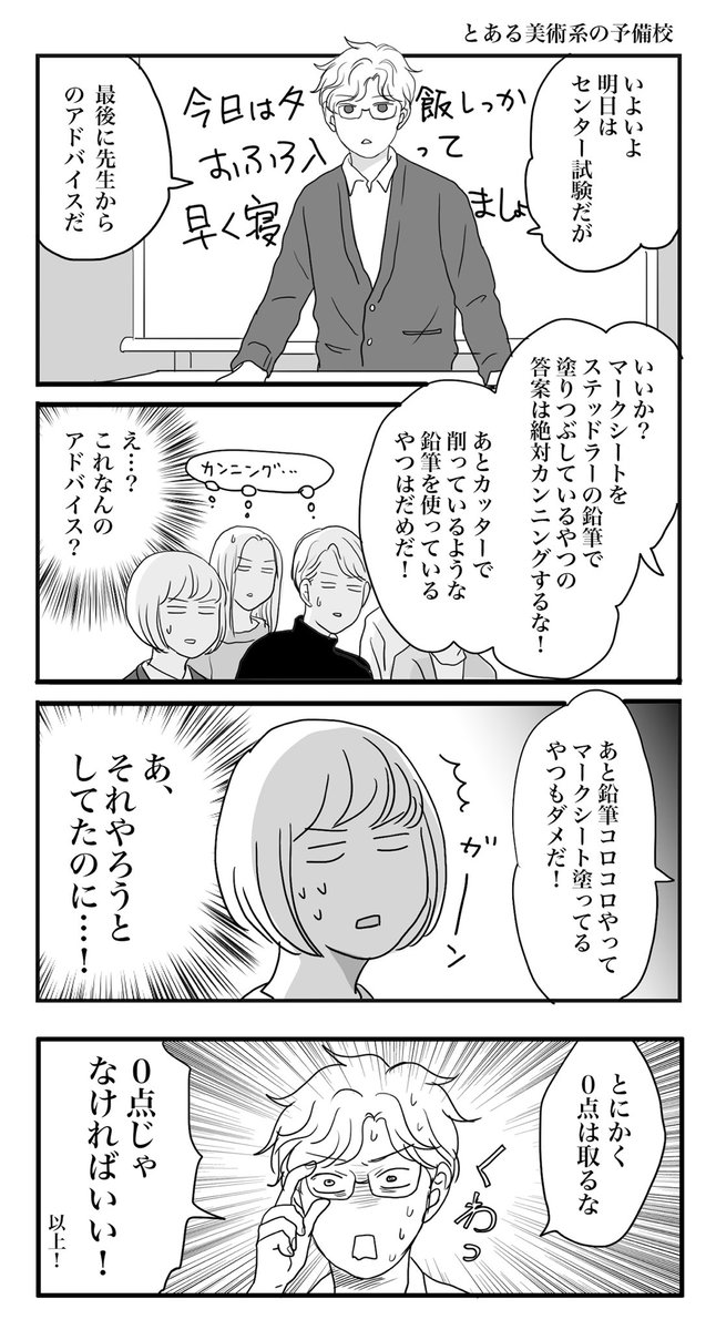 45 944 30年以上前に東京藝大を受験するにあたり、センター試験前日の講師のアドバイスが役に立たない話。 美術系の人はわかるかな… 22/02/07 22:07