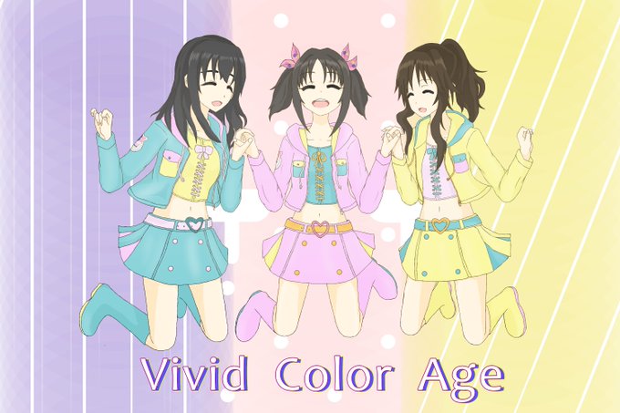 ビビッドカラーエイジの3人を描きました モバの加奈ちゃんの衣装を描きたい!と思ったんですが、雑…というかよくわからなかったです 特に靴がどうなってるのか... ご容赦ください... #ビビッドカラーエイジ