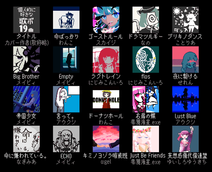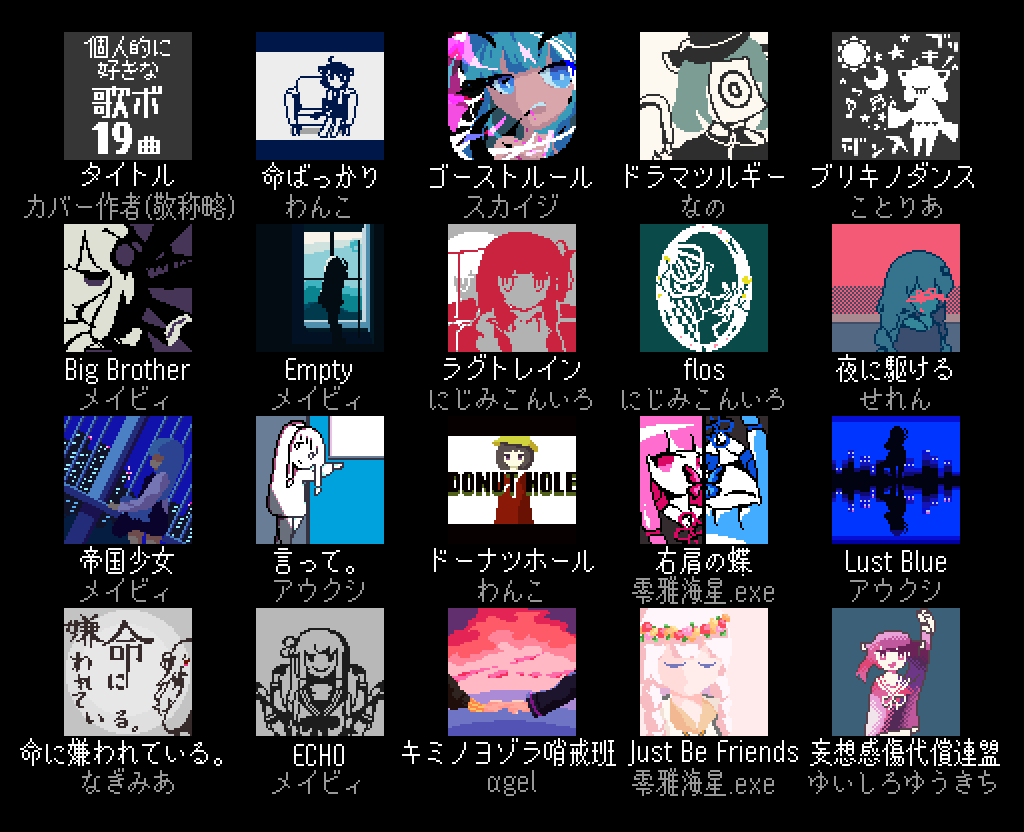 61 150 個人的に好きな歌ボのカバーアートみたいなものを描きました!19曲です #VOICEROIDドット絵部 21/05/19 20:14