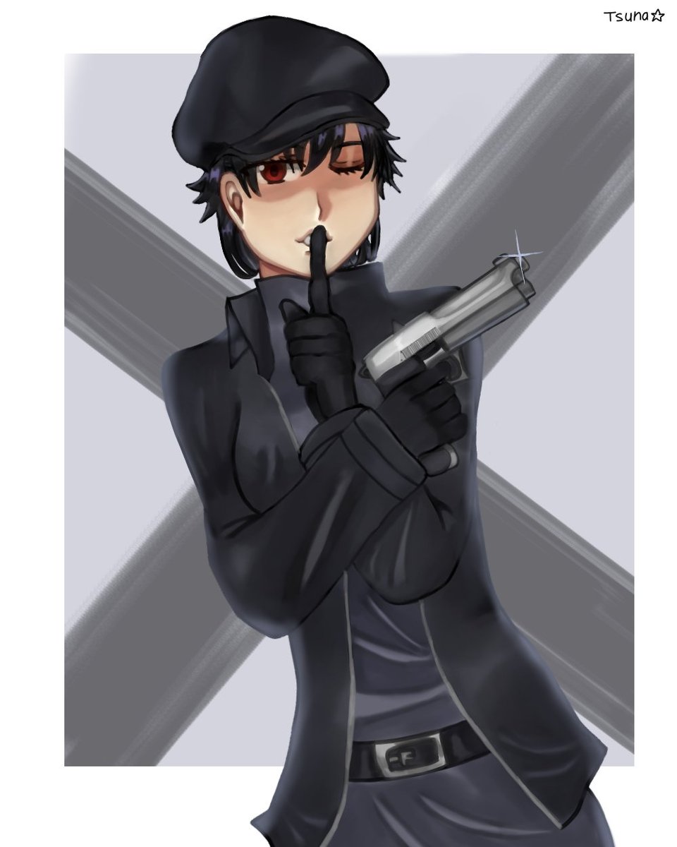 しーっ!誰にも言わないでね🤫😉 #オリキャラ #イラスト #オリジナルイラスト #女の子 #銃 #帽子 #黒髪