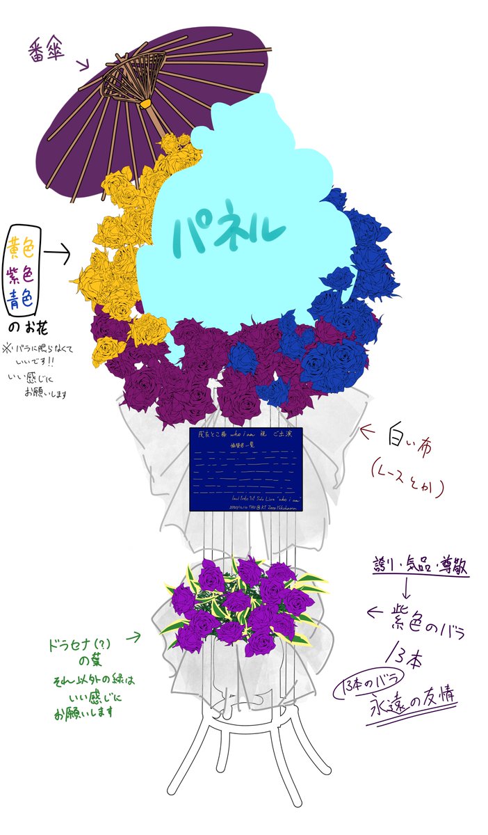 めちゃくちゃデザインに忠実に作っていただきました!というかデザインより華やかに仕上げていただいて感謝・・・! 13本の紫のバラには色、本数それぞれの花言葉を。 twitter.com/prettylife2006…