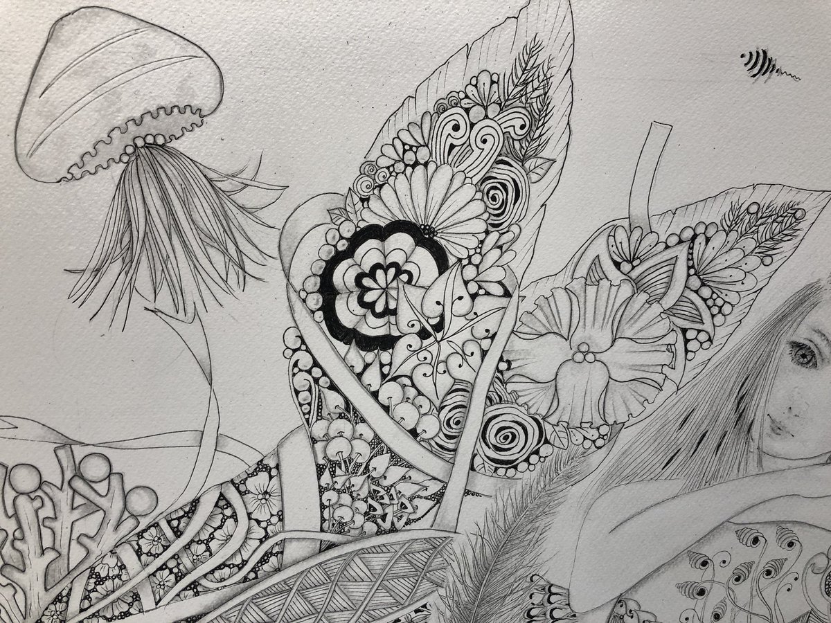 アリスを描こうとしたけど、女の子が人魚っぽいのでこんな感じに、さてどうやって色を塗ろうかな? #ゼンタングル #人魚 #女の子の絵 #イラスト #ペン画