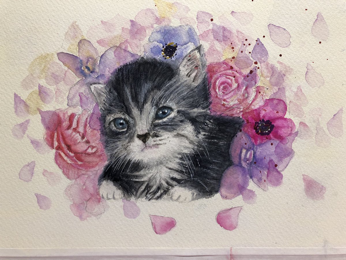 5 36 子猫のかくれんぼ「早く見つけて可愛いかくれんぼ🐈⬛」 #水彩画 #猫 #黒猫 #花 22/08/08 15:40