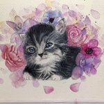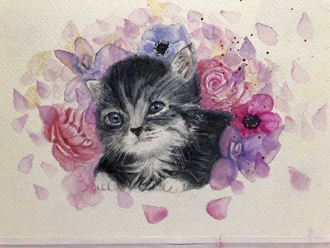 子猫のかくれんぼ「早く見つけて可愛いかくれんぼ🐈⬛」 #水彩画 #猫 #黒猫 #花