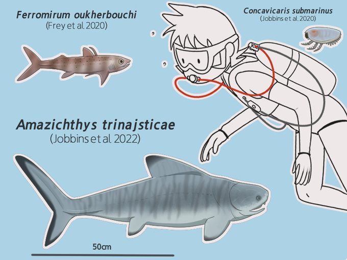 two fishes and one thylacocephalan from the Moroccan Thylacocephalan Layer. #paleoart #fosilfishart #sciart