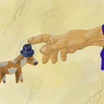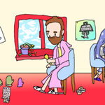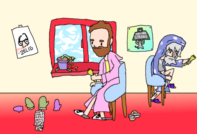 Day 25 of Gettin' Arts is Earth Stuff. Here is a simple storybook style drawing of Robot Arnie spending some quality time while regular Arnie sleeps. #Magictavern #Inktober2022 #gettinarts2022