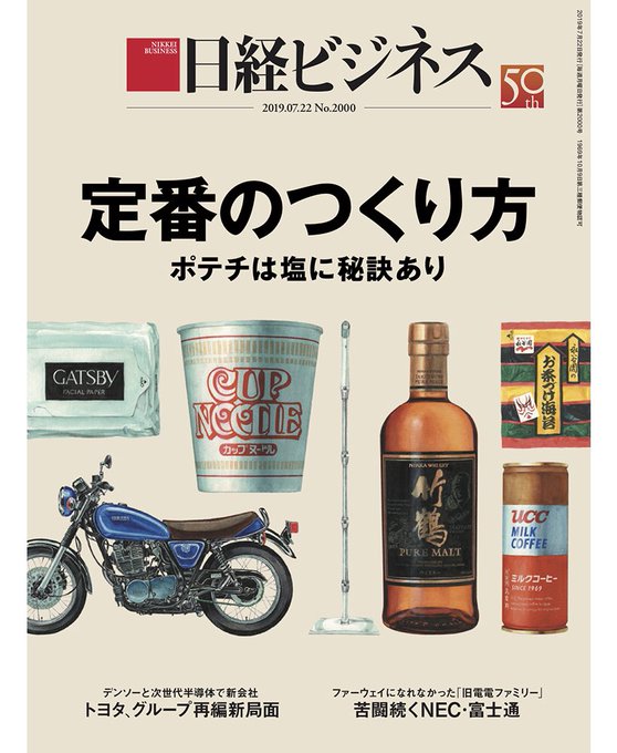 本日発売の #日経ビジネス #日経ビジネス電子版 と表紙イラストレーションを担当しました。 #カップヌードル #ギャッツビー #sr400 #クイックルワイパー #竹鶴 #永谷園のお茶漬け #uccコーヒー #イラストレーション #illustration #ペンなし #水彩 #レトロ #リアル #藤原徹司 #テッポーデジャイン