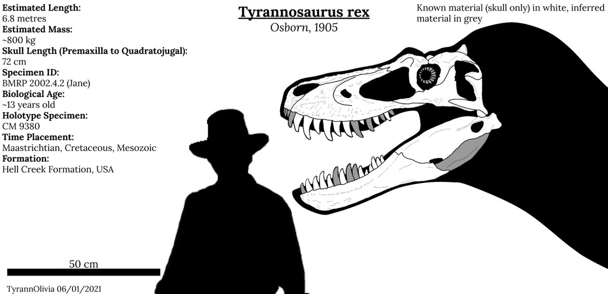 The final entry in my series of Tyrannosaurus skull reconstructions; Jane! I had a lot of fun making this one, and quite a bit of extra research went into it. Also finally got around to making my own silhouette for scaling (yes it's Alan Grant) #paleoart #tyrannosaurus