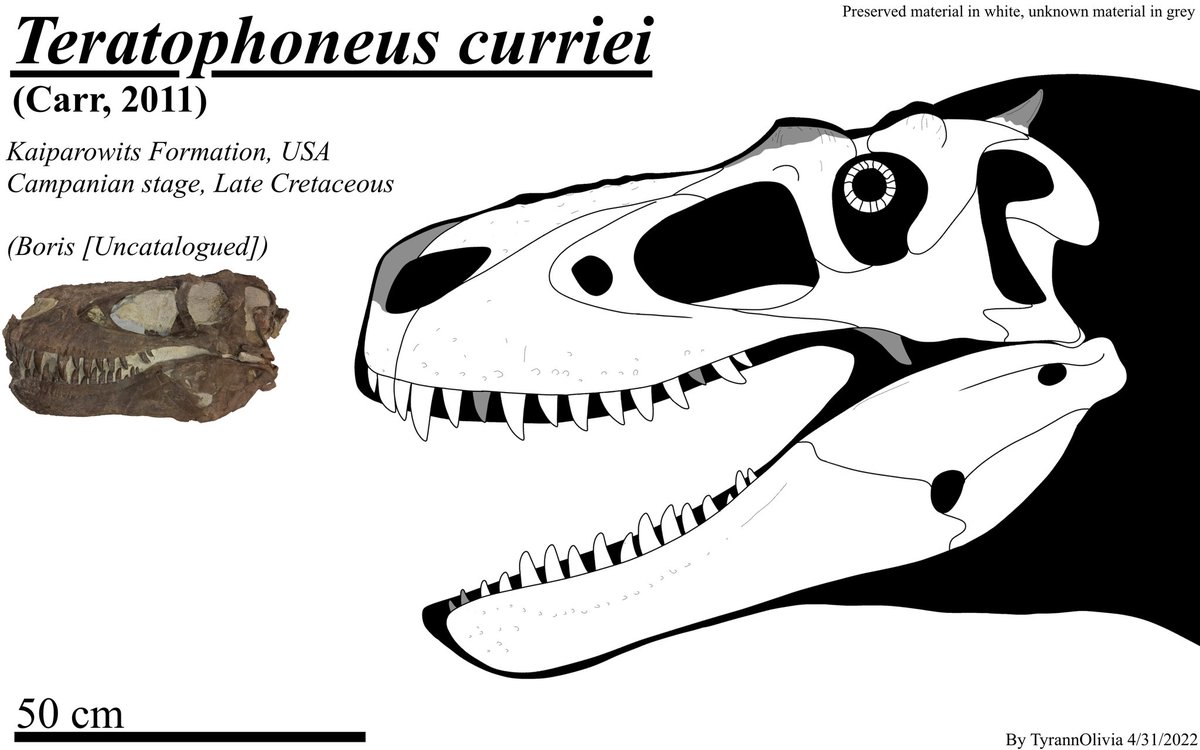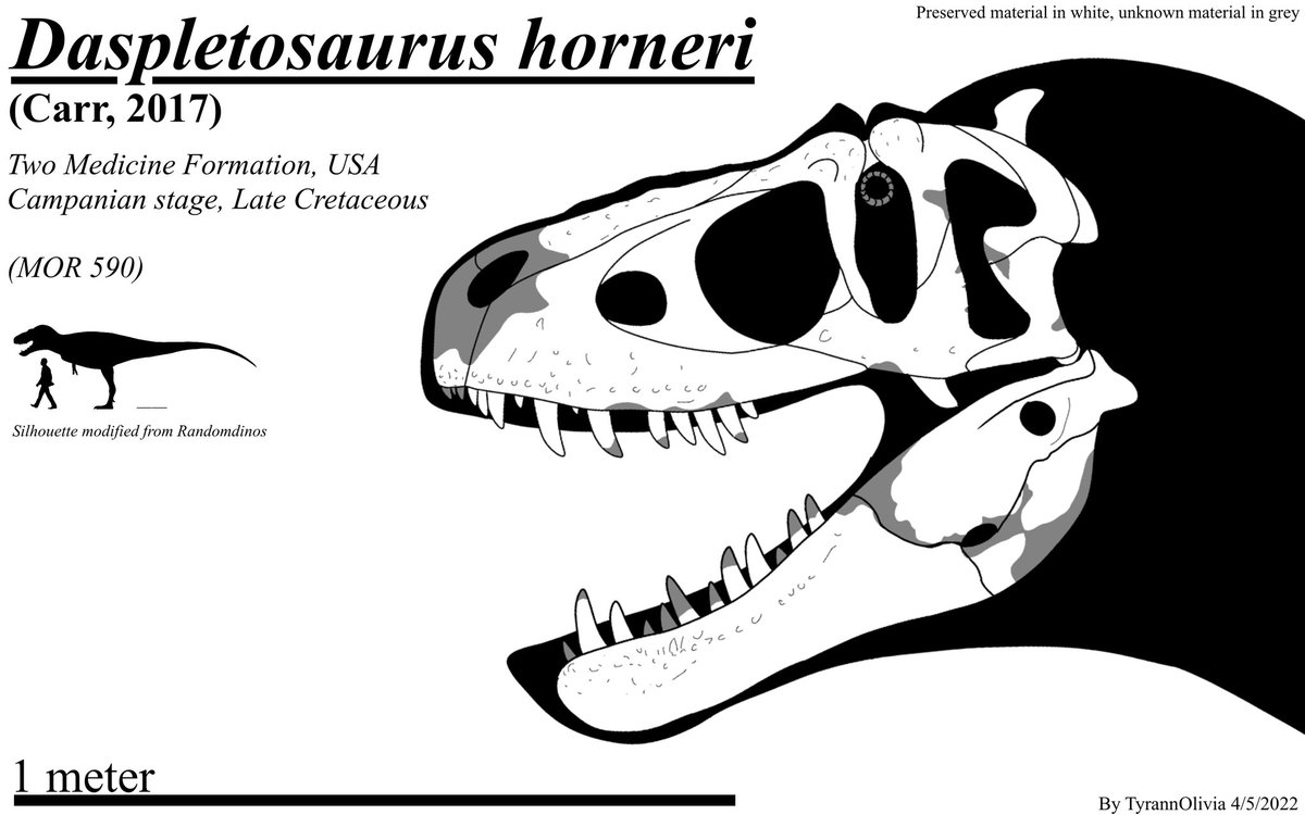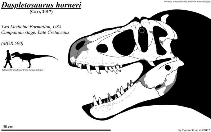 Here's the skull reconstruction with the correct scaling! I have no idea how I messed it up that bad, but thank you to everyone who pointed it out! #paleoart twitter.com/TyrannOlivia…