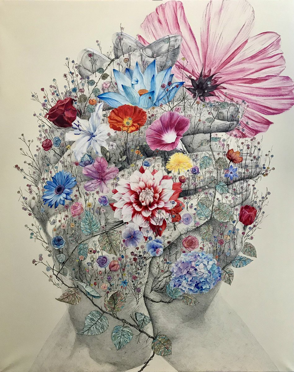 今週末の進捗 左上の花は牡丹です #ペン画 #想像画 #週末趣味没頭 #途中経過