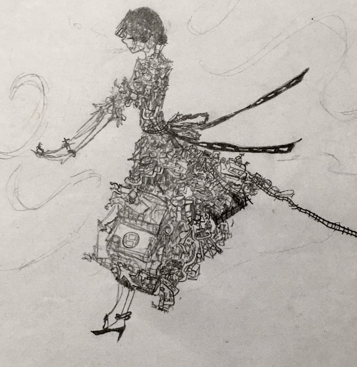 摩天楼の裾を引き摺って大きなものが歩いてるイメージ。描きかけ #イラスト