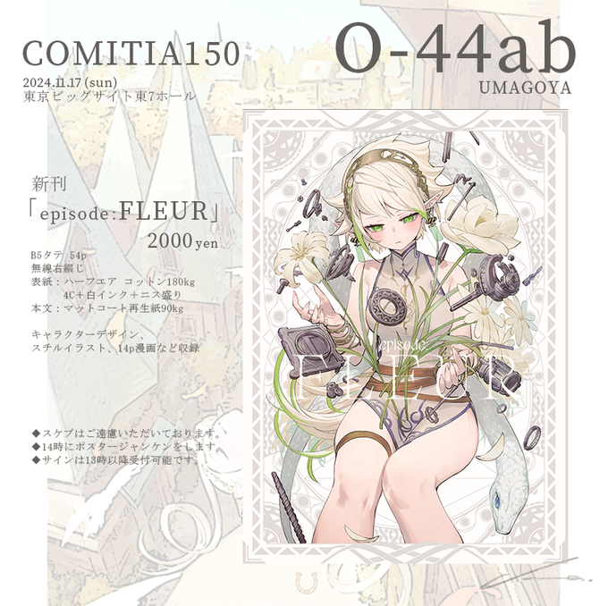 【おしながき】 11/17 (SUN) COMITIA150にて 新刊「episode:FLEUR」を出します イラストも漫画も色々詰め込んだ本文50ページの大ボリューム本になってます! 表紙は白紙に白インクとニス盛の特殊加工と面白い印刷にしてみました😋 東7ホール「O-44ab」にてお待ちしております~! #COMITIA150