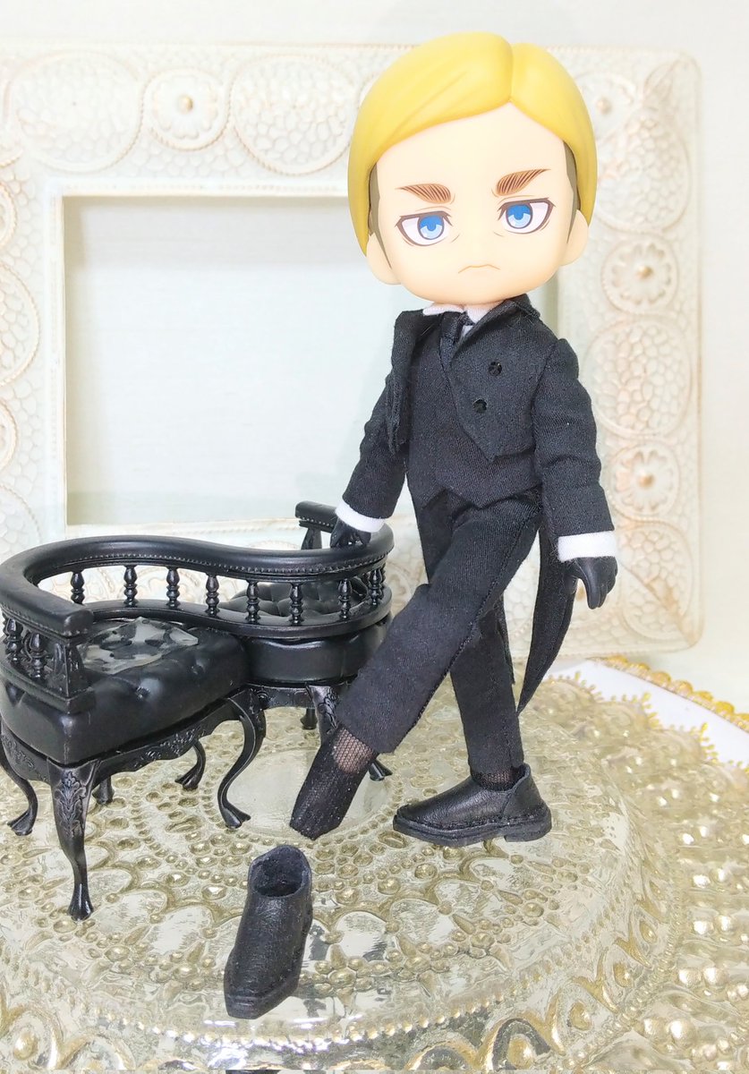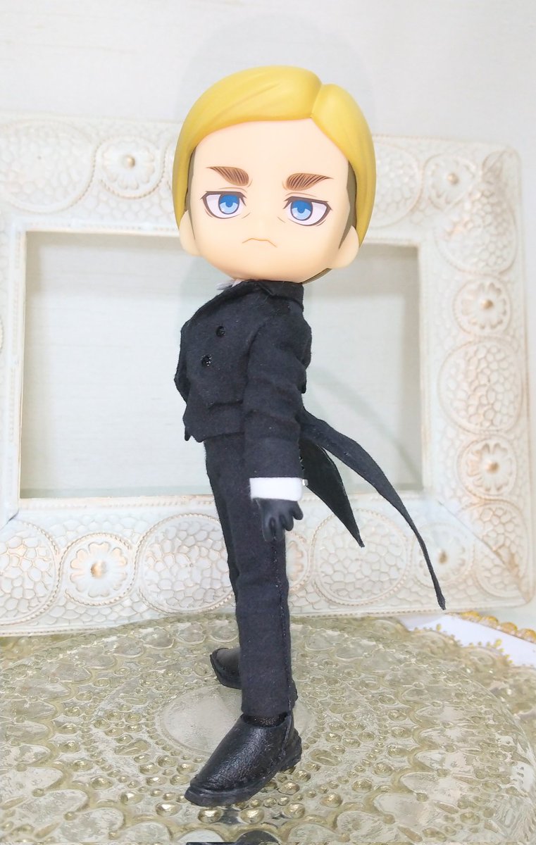 🖤燕尾(エルヴィン)団長🖤 188cmの団長… 身長差を出したくて身長調整キット+オビ球の五条センセのボディをお借りしました ↓↓↓ twitter.com/UNDEUX_mond/st… するとパンツが短くて💦💦 紳士靴下を履かせました ちなみにいつも黒靴にはオビツ黒ボディの足を付けてます #オビツろいど