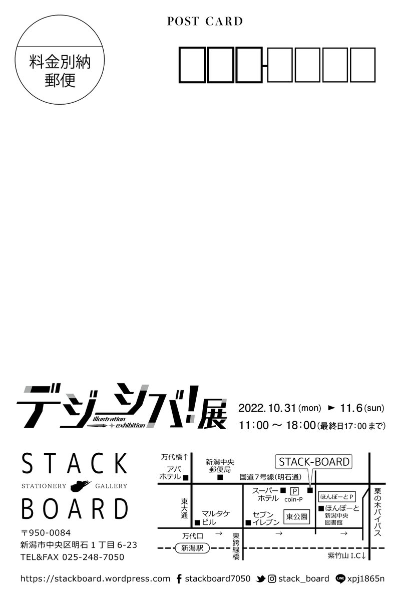 【企画展告知】 ◆Postcard! Postcard! ◆11/11〜11/25 ◆スタックボード (新潟市中央区明石1丁目6-23) ギャラリー内の壁面いっぱいに全33組の作家のポストカードを展示販売。 すべりこみで参加させていただきました😊 よろ🤟 #スタックボード #展示会 #イラスト