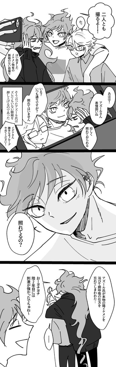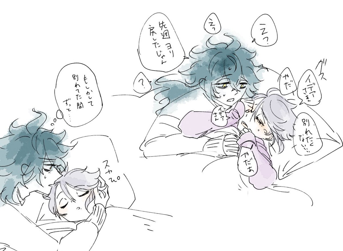 普通に話してるだけだけどめちゃくちゃ距離が近い付き合ってる💀🐙とぬいぐるみと寝てるイデヤくんのらくがき