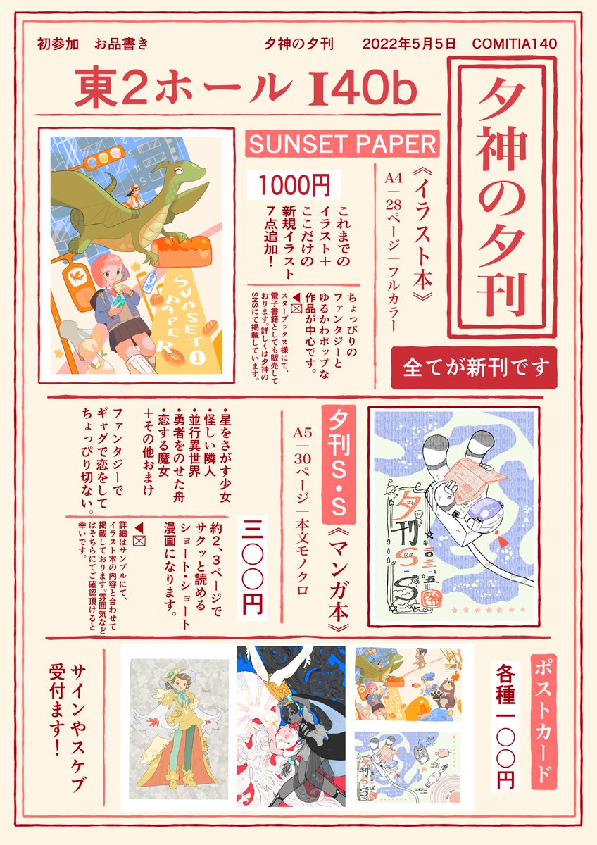 5 11 [コミティア 140:お品書き] 初参加になります!東2/ I40bにて。 当日は売り子を引き受けてくれた友人(ばってぃー)と2人で対応していきます。よろしくお願いします!🙇♀️ #お品書き #COMITIA140 #コミティア140 #創作 22/05/03 17:12