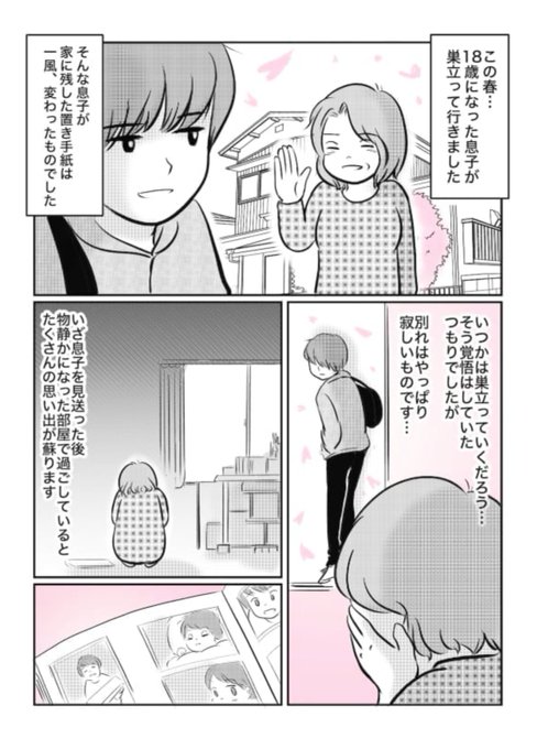 今日から4月🌸巣立っていく息子を見送る母親のお話です。(4p) 新しい門出、新年度に向けて肩肘はらず歩んでいけたら。 数年前に描いたママスタさんでの漫画 select.mamastar.jp/300861 #漫画が読めるハッシュタグ #育児漫画