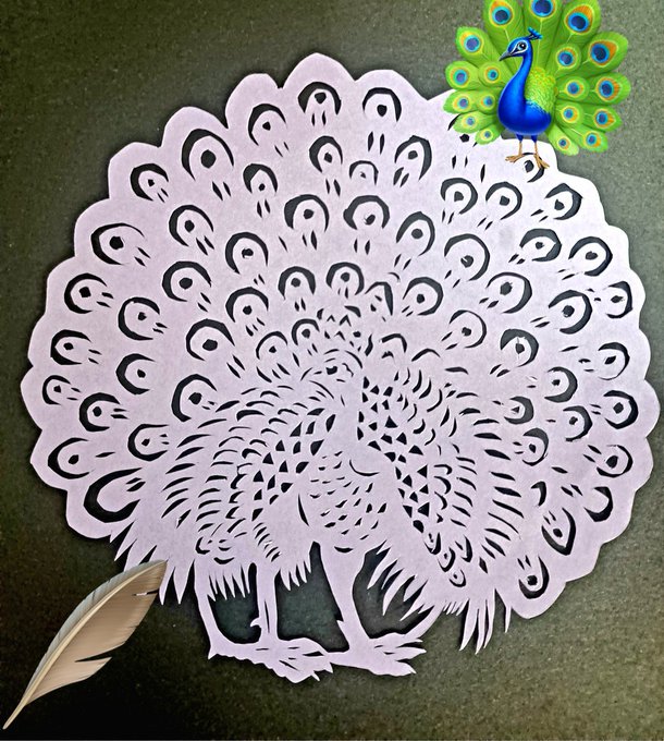 15 232 今晩は井上志源です。 孔雀の切り絵を創ってみました。 折り紙で切ったのですが紙が柔らかすぎて上手く切れずかなり粗削りです😭 #孔雀 #切り絵 23/04/12 21:12
