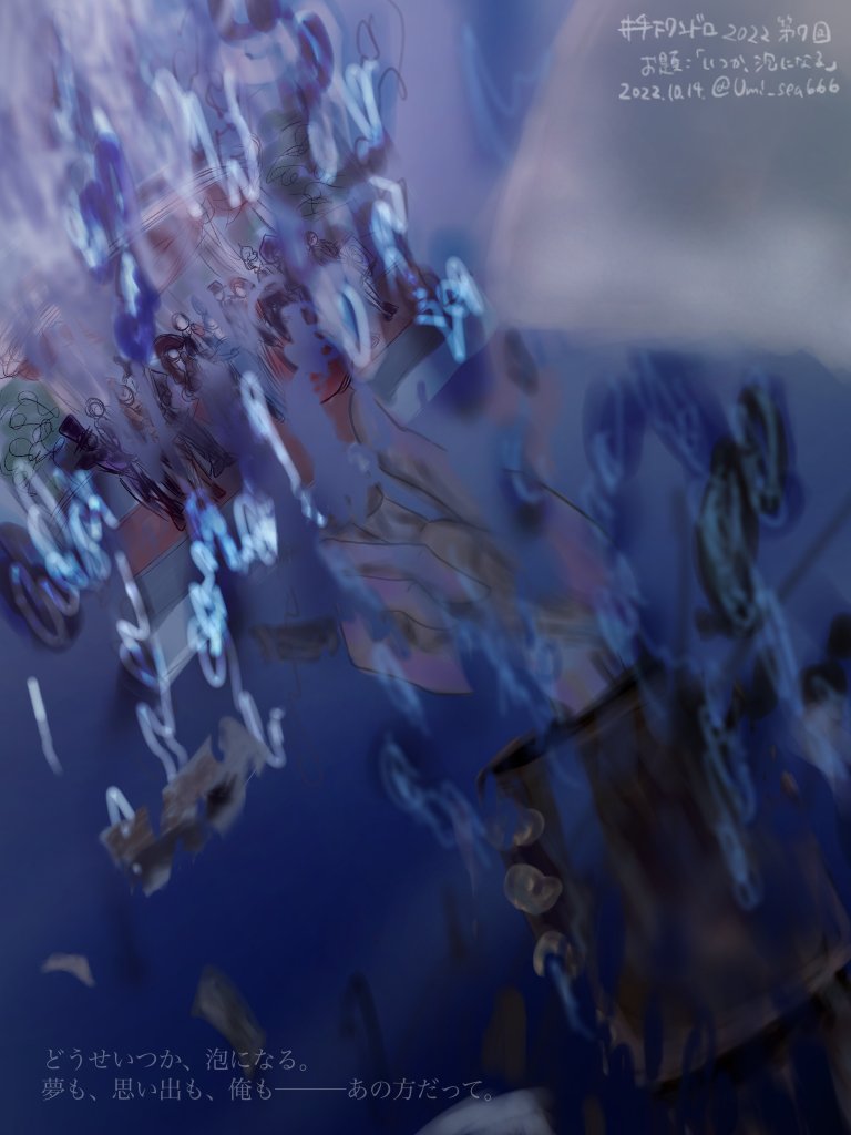 7 35 お題:「いつか、泡になる」 どうせなにもかも、消えてなくなっちまうんだ、俺たちは────それでも。 #手下ワンドロ2022 22/10/14 23:06