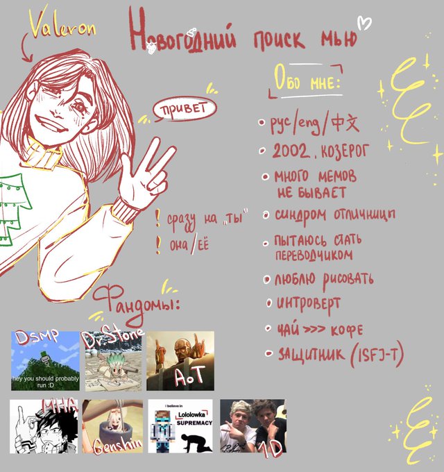 Новогодний #поискмью и #закреп - халоу, прекрасные люди🛐 Если вы чувствуете себя комфортно на моем профиле, то давайте станем мью👉👈 Часто щитпостинг и фандомный ор, но думаю у меня весело Также выставляю порисушки #ArtistOnTwitter Буду рада рт🤍 с наступающим 🎄🎅