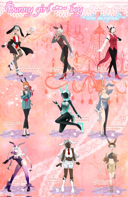 #バニーガールandバニーボーイ誰デザ (すみません!不備があったので上げ直しです!) ゆうぼうさん主催の誰デザに参加しました!!! 私が描いたのは9番の子です!!!めちゃくちゃ可愛いんじゃ……! 私がデザインしたバニーはどれでしょうか!!よろしくお願いします!