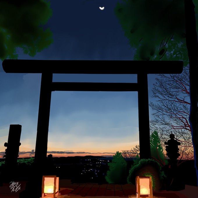 昨日の義勇さんのお誕生日イラストに使用した背景🤣 以前描いた天空の神社の鳥居と同じ構図をもう少し広げて、朝焼け前のブルーモーメント。 結構気に入ってます。 #イラスト #絵描きさんとつながりたい あ、ちなみに四国の神社がモチーフでは無いです。神奈川です。