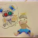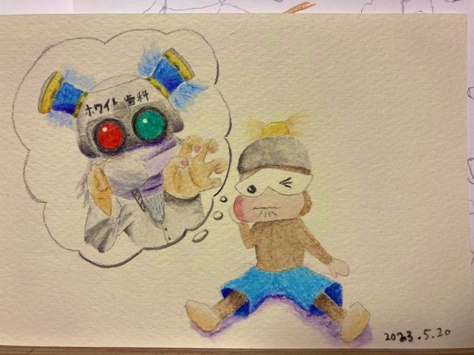 「親知らず抜いてきた🦷」 ウッキーホワイトが営むホワイト歯科で歯の治療をした水色パンツ君 サルゲッチュ久しぶりに描いた✏️ 色が同化して見ずらい🥺 #ウッキーファイブ #ピポサル #イラスト練習中 #絵描きさんと繋がりたい #イラスト好きさんと繋がりたい #アナログ画 #色鉛筆 #水彩色鉛筆