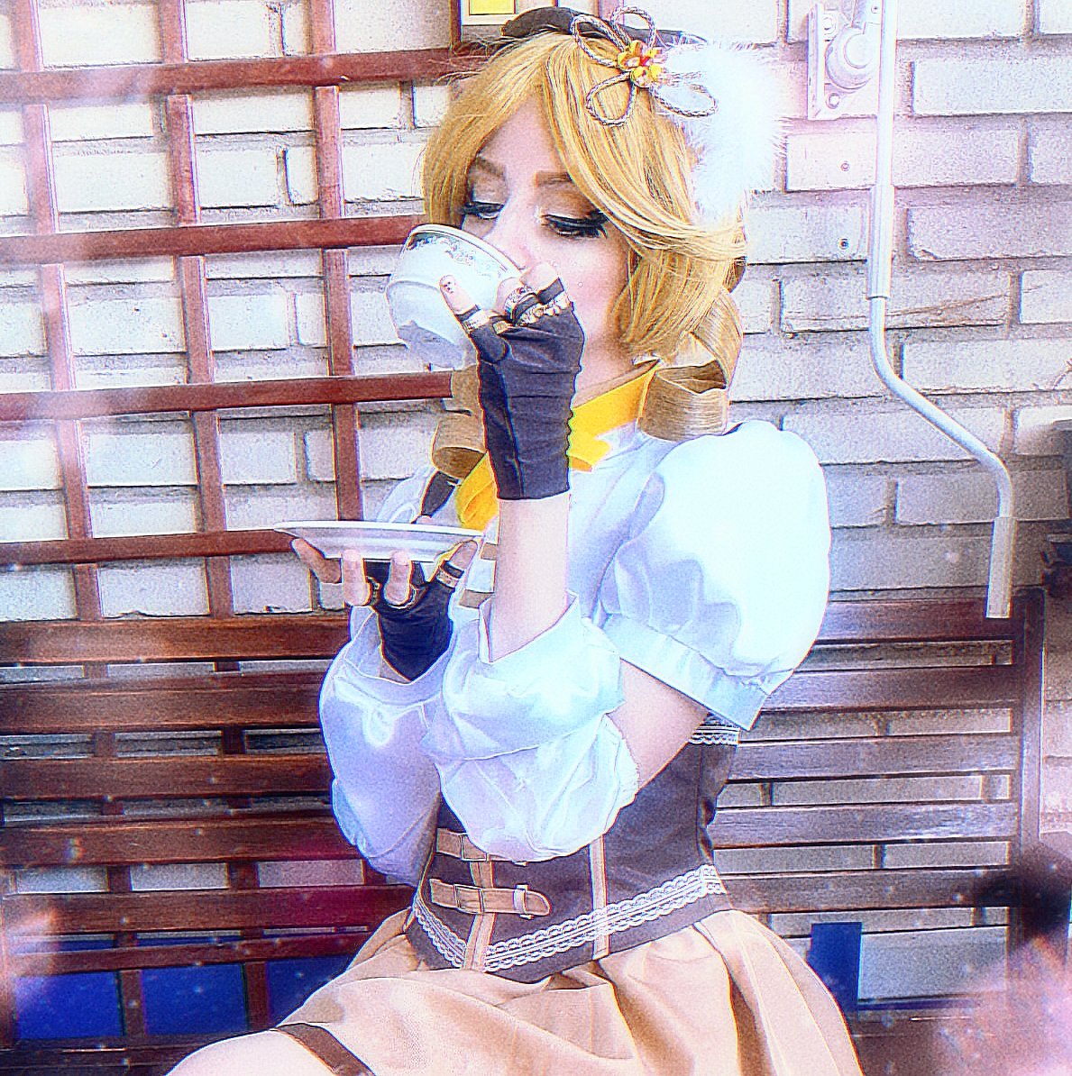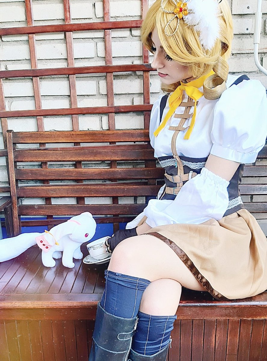 Tomando un tecito con mi pana Kyubey💛. Acabo de firmar un contrato con él, parece de fiar. 📷-> Takarokko Los personajes originales fueron diseñados por Ume Aoki y pertenecen al estudio Shaft. #tomoemami#puellamagimadokamagica #cosplay