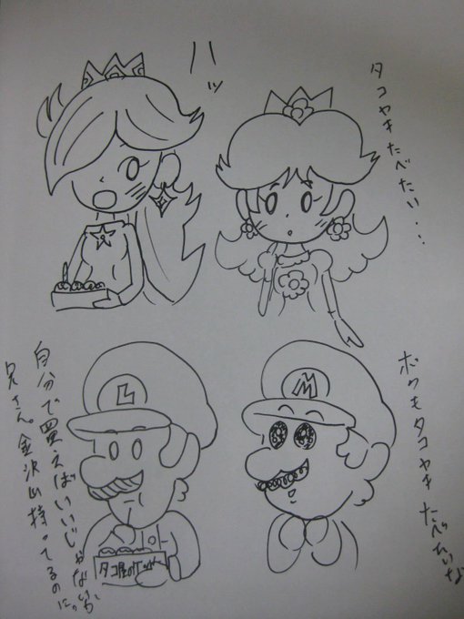3 7 マリオの落書きパート① たこやきが食べたいの巻 たこ焼きが食べたくなったのでふっと描きたくなった絵。 わざわざたこやき買いにマリオワールドへ行くロゼッタ様を考えると少し面白い。てかマリオワールドにたこ焼きあるのかな(笑) 15/06/06 23:08