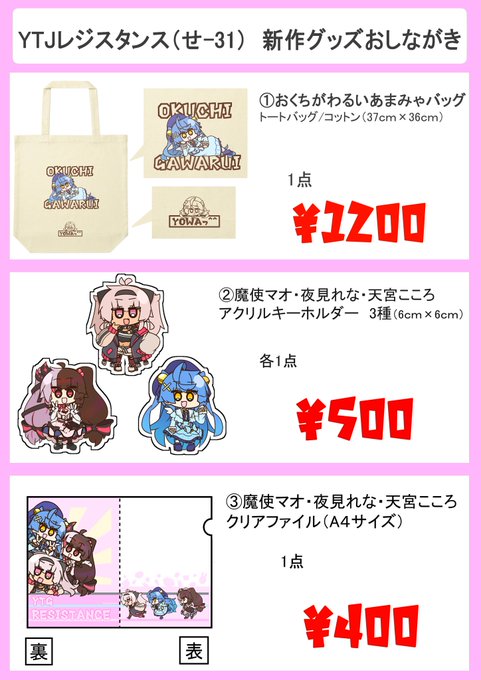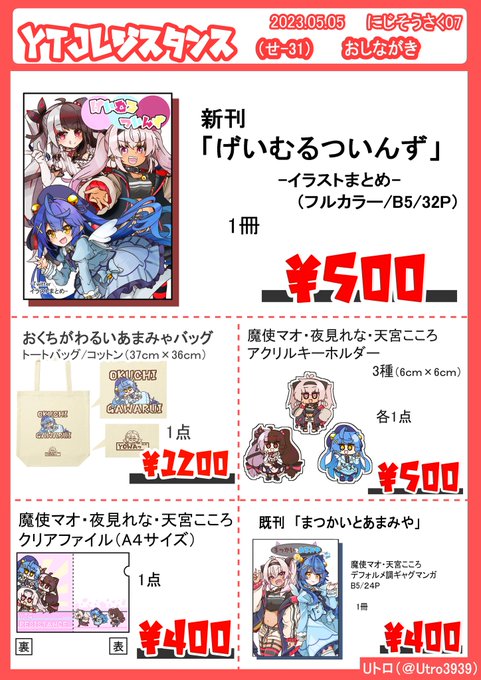 14 37 YTJレジスタンス(せ-31 ) グッズ 新作 ①トートバッグ ②アクリルキーホルダー ③クリアファイル げーむるの3人のグッズを各種用意しました 実用でも使えるファイルやバッグ等あるのでぜひぜひ #にじそうさく07 23/04/30 22:46