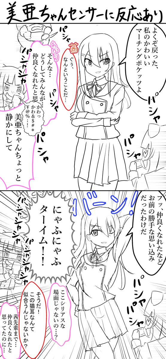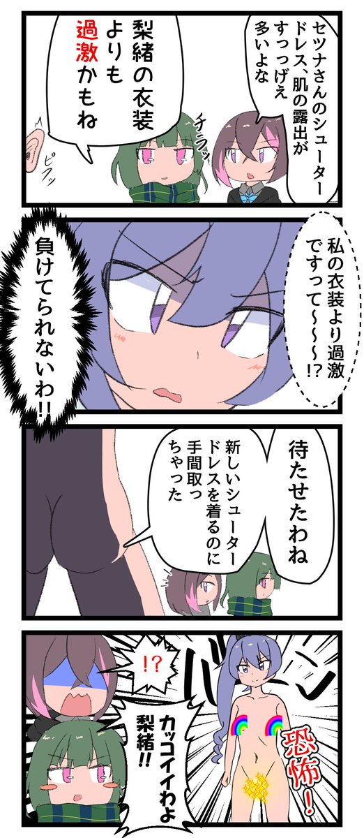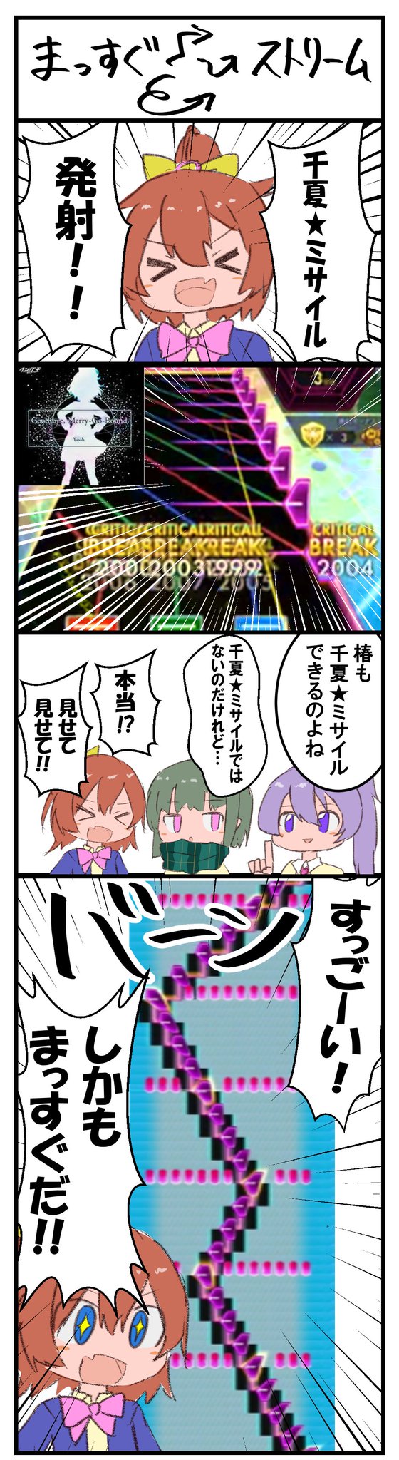 32 85 オンゲキの藍原椿と高瀬梨緒と結城莉玖の、ほのぼの日常4コマ描きました!☺ #オンゲキ 21/10/13 19:10