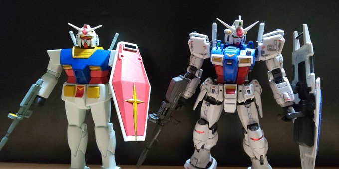 13 115 #ガンダムの日 #旧キット カッコいいのは断然右なんだけど、最近左の味わいがたまらない。 20/07/08 23:57