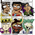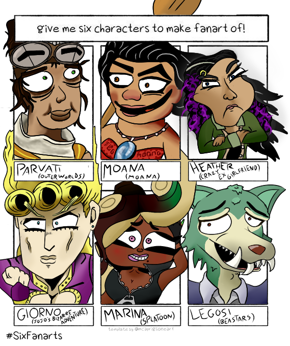 Did the #sixfanartchallenge finally, featuring Parvati (The Outer Worlds) Moana (Moana) Heather (Crazy Ex-Girlfriend) Giorno (Jojo's Bizarre Adventure) Marina (Splatoon) Legosi (Beastars) Might do it again; this was a lot of fun! #SixFanarts