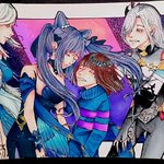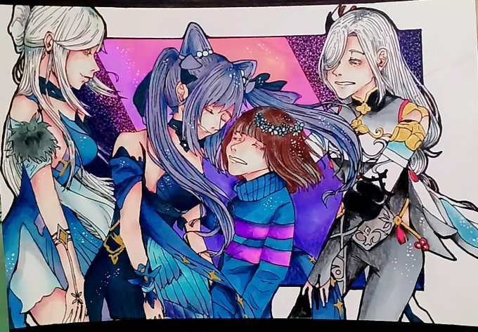友達にあげた誕生日イラスト 原神のキャラ3人とフリスク 原神の服難しすぎる… #イラスト #原神 #アンダーテール #コピック