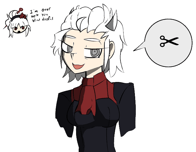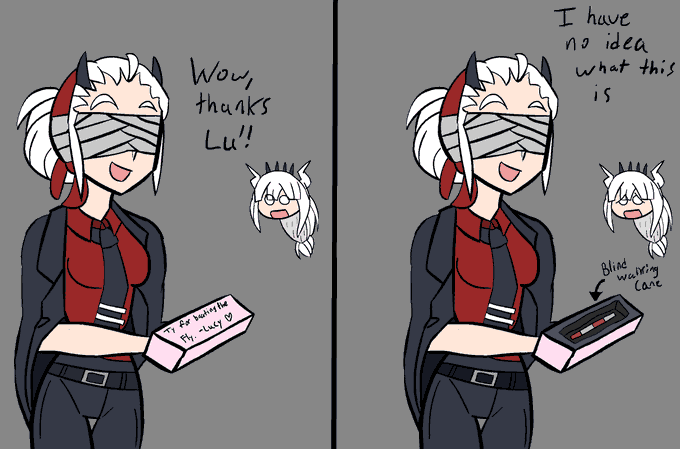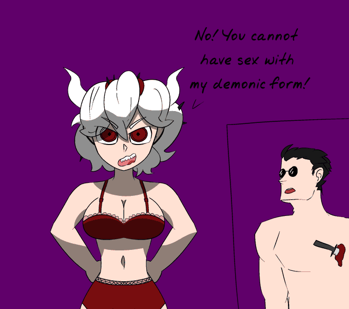 goofy idea time Justice insists she doesn't need it (She'd rather just hold onto Lucy's arm) #Helltakerfanart #helltaker