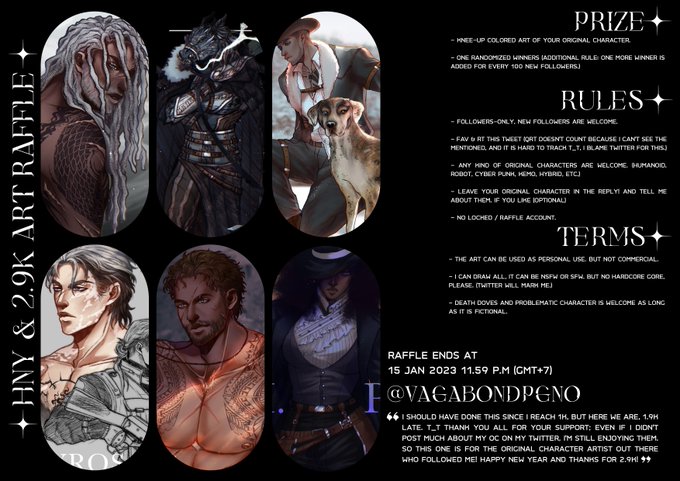 🍻2.9K & HNY FAN-ART RAFFLE Surprised! This one is for OC artists! Thank you for the 2.9K! Rules: ➣Follower only (new followers are welcome) ➣Fav & RT ➣Leave your OC in the reply. 1 Randomized winner. Ends 15th Jan 2023 11.59 P.M. (GMT+7) #OCArt #ARTRAFFLE