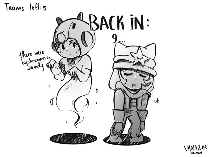 Sandy Koya and Chimmy Ruffs found cute little robot!.. but where is his teammate in this duo showdown match? Teams left: 4 . #BrawlStarsxBT21 #BrawlStarsxBT21FanArt