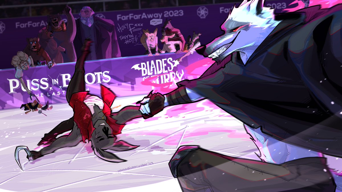 This is my contribution to the Puss In Boots x Blades of Furry AU! Enjoy Death and Vlad shredding up the ice rink in the edgiest way possible, just like nature intended x3 Also go read Blades of Furry by @DeyaMuniz and @emilyerdosart if you haven't yet! #furryartwork