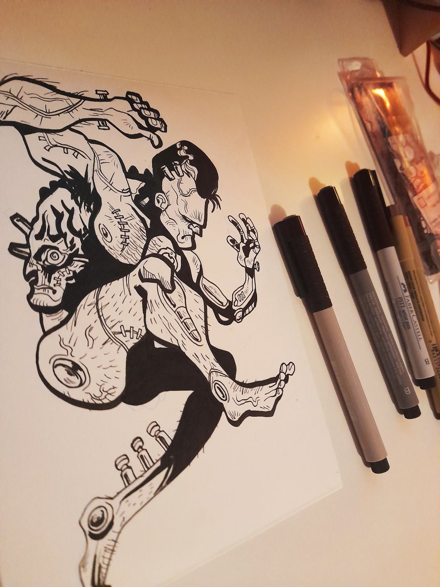 Day 23 Frankestein 💀 I hope you like it, support me a lot or I will have to jump on the train tracks! 🖤🚉 #mabsdrawlloweenclub #challenge #inktober2021 #inktober #terror #frankenstein #traditionalart #veganya #vegossus