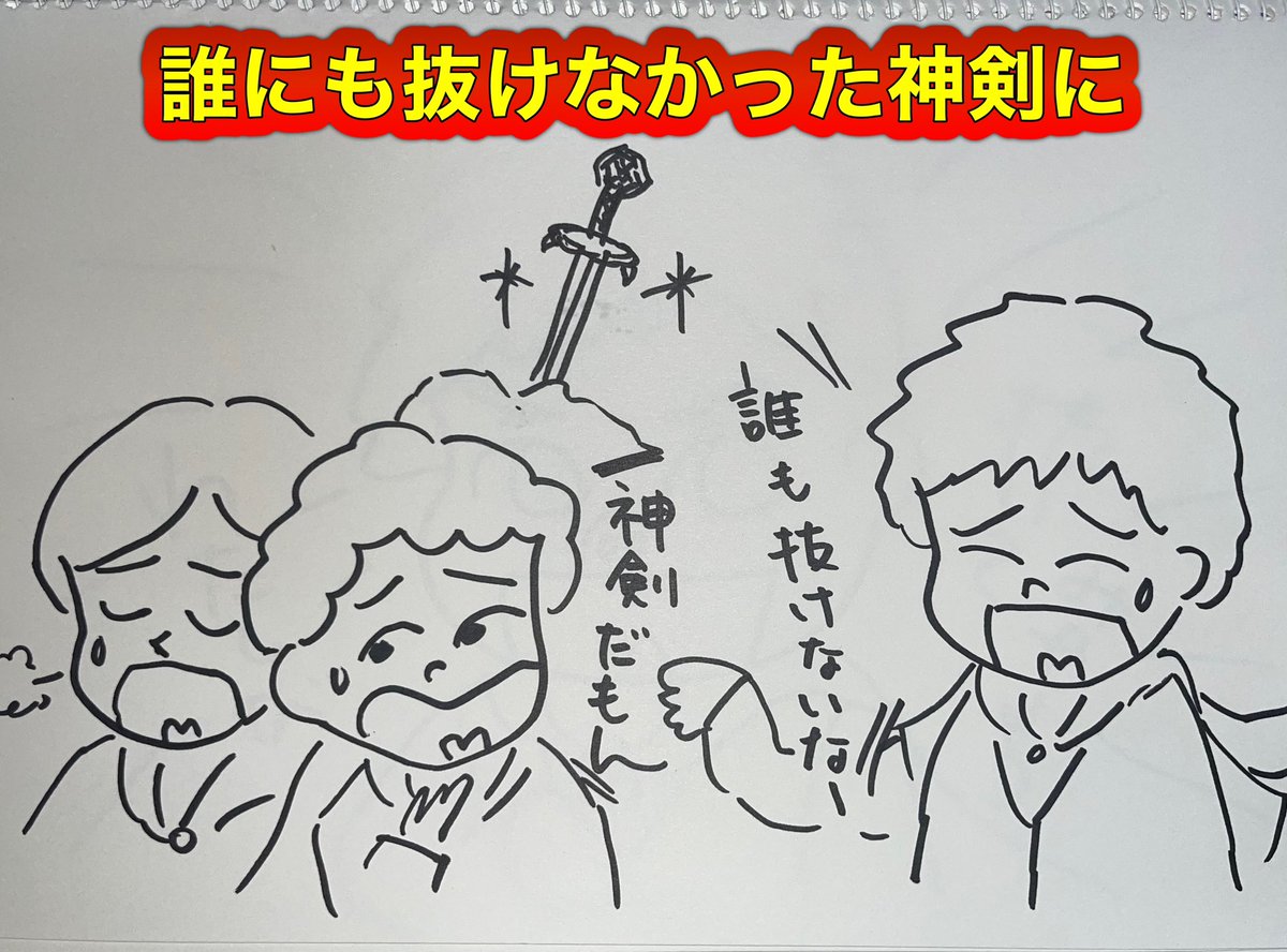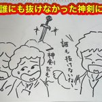 【ママの4コマ劇場 47】 「エクスカリバーを抜いて勇者になった結果…」の巻 #漫画が読めるハッシュタグ #4コマ漫画 #漫画 #大山ViVAのお客さま以外の人が読むのはきびしい #漫画というより落書きでごめんね 🙇♀️