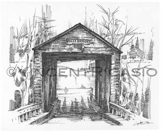 'Bulls Bridge' - Kent, CT. Pen & ink. 1 of 3 covered bridges in the Nutmeg State. #BullsBridge #CoveredBridge #Kent #CT #NWC #Drawing #Art #Illustration #Travel #PenAndInk