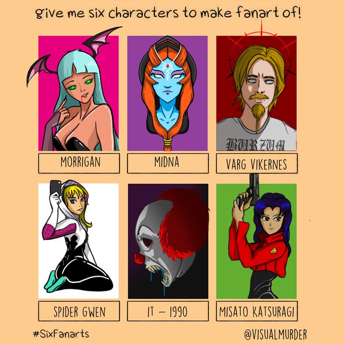 I finished the #sixfanart challenge and these are the results 😁 1. #morrigan 2. #midna 3. #vargvikernes 4. #spidergwen 5. #it 6. #misatokatsuragi . #huiontablet #capcom #thelegendofzelda #burzum #multiverse #terror #evangelion #SixFanartsChallenge #SixFanarts