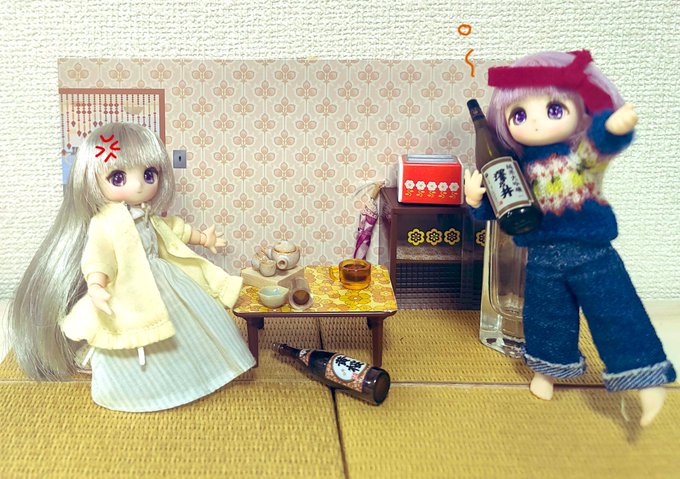 #今夜のドール撮影120分一本勝負 お題 ふらつく 🍫「ちょっとあなた飲み過ぎよ!」 🍬「あへほへあへ‥」 #シュガーカップス #アゾカツ