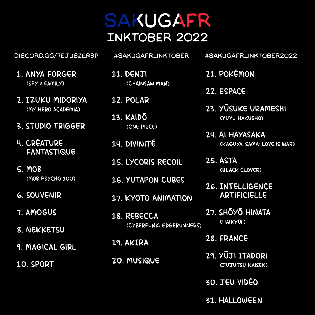 11 23 On organise un #Inktober avec une liste personnalisée sur SakugaFR : discord.gg/7ejuszEr3p Le Discord réunit les français/francophones passionnés par l'animation, peu importe le niveau de connaissance, c'est ouvert à tous! #SakugaFR_Inktober #SakugaFR_Inktober2022 22/10/01 00:00