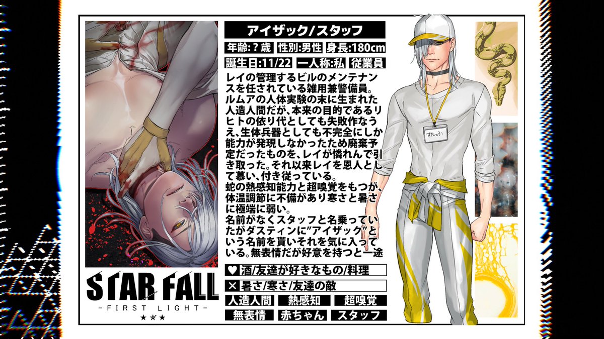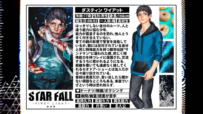 〚𝗦𝗧𝗥𝗔 𝗙𝗔𝗟𝗟〛 米国架空の都市『スターフォールシティ』が舞台の一次創作BL。異能バトルとかSFとか暴力とか片思い、メインCPはダスティン×レイでイラスト描いたり雑多に捏ねて遊んでます。 MAIN : #STAR_FALL_EP1 FA : #STAR_FALL_FA ▼キャラクター概要(1/2)