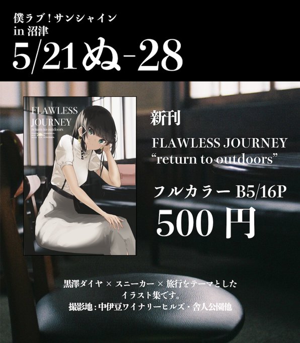 【新刊告知】 5/21(日)の僕ラブ!in沼津8にて黒澤ダイヤ×旅行×スニーカー イラスト集"FLAWLESS JOURNEY"を頒布いたします。 大人になったダイヤさんが沼津でワインを楽しんだりしています🍷 B5フルカラー/16p/500円 #沼ラブ #沼ラブ8 #lovelive