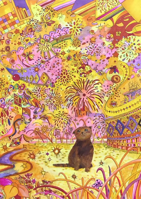 『Orange firework』 #art #artist #yellow #cat #copic #orange #pink #flowers #fireworks #star #heart #first #challenge #painting #イラスト #ピンク #黄色 #赤 #絵 #イラスト #芸術 #イラストレーターさんと繋がりたい #コピック #猫 #花火 #花 #夏 #オレンジ #星 #夏祭り #草