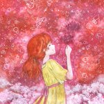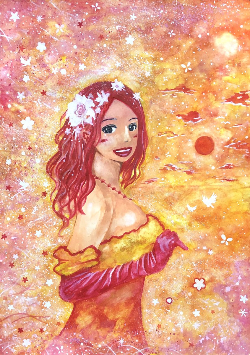 『しあわせの朱色』 #絵画 #水彩画 #女の子 #赤 #夕焼け #黄色 #幻想的 #イラスト好きな人と繋がりたい #イラスト #花 #風景 #オレンジ #光 #painting #paint #woman #beauty #pretty #涙 #絵 #芸術