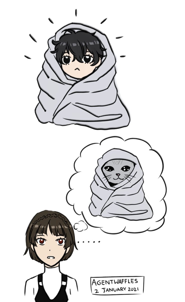 You know those memes with the cats in blankets? Yeah, that's essentially what this is. #persona #persona5 #shumako #MakotoNiijima #akirakurusu #RenAmamiya #art #fanart