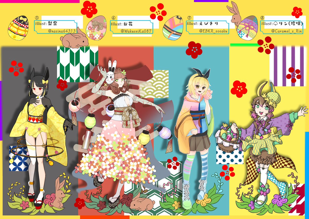 #誰のキャラデザだゲーム テーマは【和風×イースター】 梨沙さん主催の企画に参加させていただきました!初✨誰デザ参加なのでワクワクしながら描きました☺️🌸 お花のイラスト▶︎⑥ お花のデザイン▶︎どれでしょうか! リプ欄に繋げますので、ぜひ投票頂けますと幸いです。